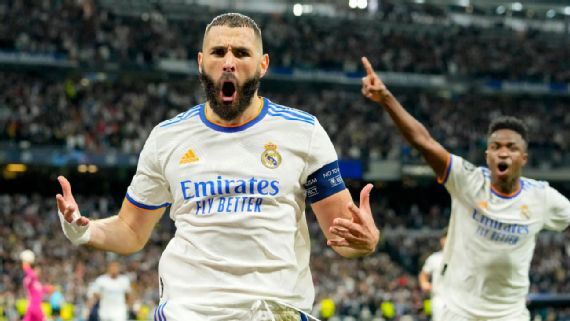 In the round of 16, Paris Saint-Germain dominated Madrid in the first leg in France, then did the same in the first half in Spain, roaring out to a 2-0 aggregate lead thanks to a pair of goals from Kylian Mbappe. VAR and a couple inches of space were all that prevented the gap from being even bigger ... and then Madrid scored three second-half goals in 17 minutes to flip the tie on its head. In between, Madrid blew a 3-1 lead at home and went down to Chelsea 3-0 at the Bernabeu -- only to score in the 80th minute to salvage some extra time, where the DNA or the magic took over once again, and Benzema scored the winner.